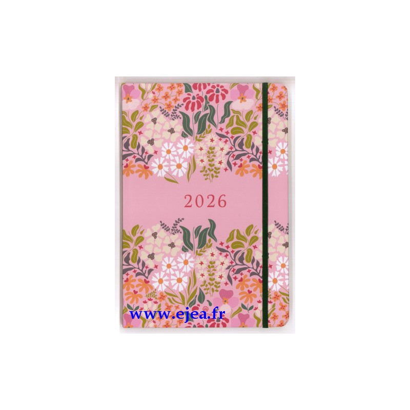 de Janvier à Décembre 2026 Calendriers, vacances scolaires, informations pratiques, atlas en couleurs. Planning vertical 1 semaine sur 2 pages avec cadres et espaces de notes, impressions en couleurs, pages blanches, coins perforés et signet marque-page, couverture cartonnée rigide, fermée par un élastique. Format 16,5x24cm.