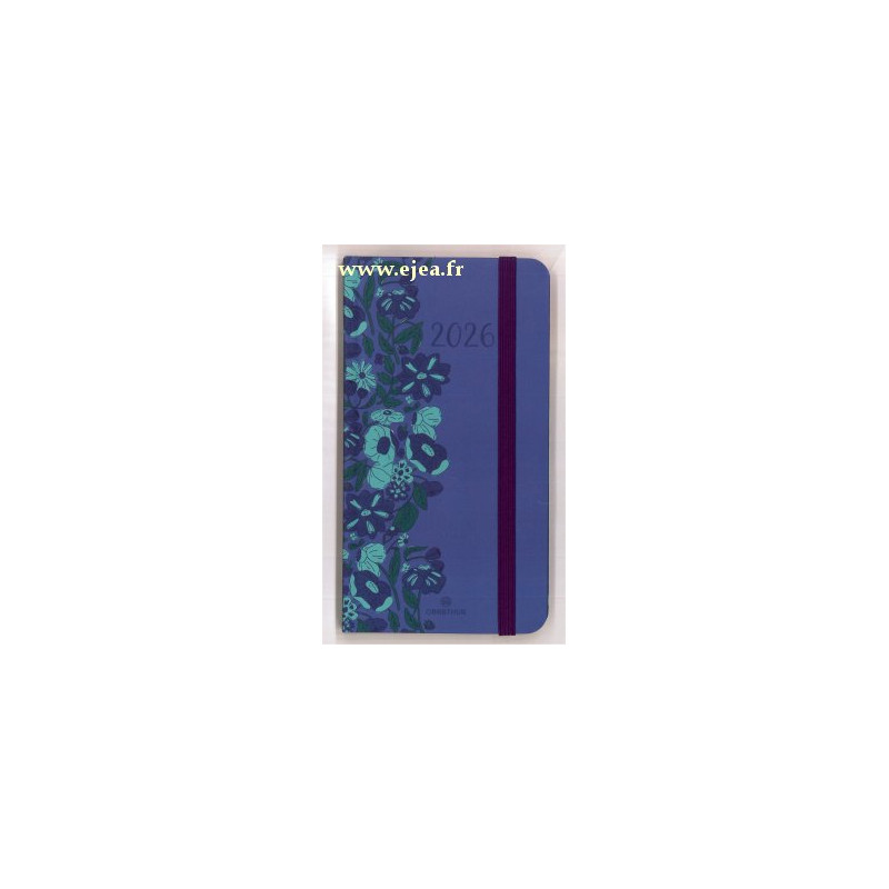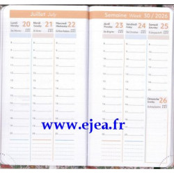 de Janvier à Décembre 2026 Calendriers, vacances scolaires, informations pratiques, atlas en couleurs. Planning vertical 1 semaine sur 2 pages avec cadres et espaces de notes, impressions en couleurs, pages blanches, coins perforés et signet marque-page, couverture cartonnée rigide, fermée par un élastique. Format 9,5x17cm.