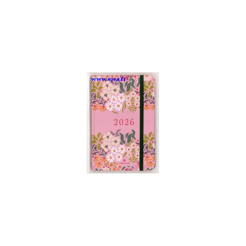de Janvier à Décembre 2026 Calendriers, vacances scolaires, informations pratiques, atlas en couleurs. Planning vertical 1 semaine sur 2 pages avec cadres et espaces de notes, impressions en couleurs, pages blanches, coins perforés et signet marque-page, couverture cartonnée rigide, fermée par un élastique. Format poche 10,5x15,5cm.