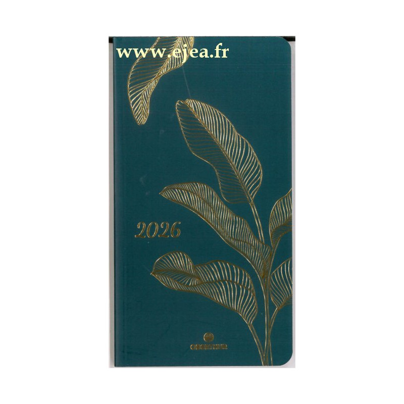 de Janvier à Décembre 2026 Calendriers, vacances scolaires, informations pratiques, atlas en couleurs. Planning vertical 1 semaine sur 2 pages avec cadres et espaces de notes, grilles de couleurs différentes, pages blanches, coins perforés, couverture souple avec motifs en relief métallisé. Format 9x16,5cm.