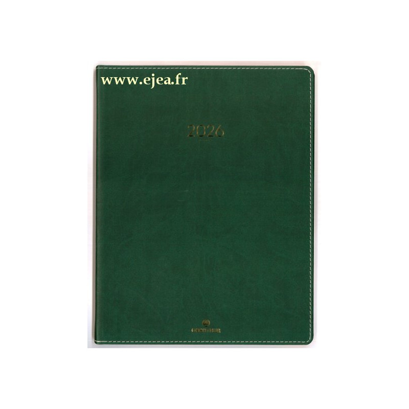 21x27,5cm de Janvier à Décembre 2026 Calendriers, vacances scolaires, informations pratiques, atlas, répertoire. Planning vertical 1 semaine sur 2 pages. Pages blanches, impression 2 couleurs, coins perforés, cordon marque-page signet, couverture cartonnée rigide simili cuir surpiqué imprimée en relief, fabriqué en France.