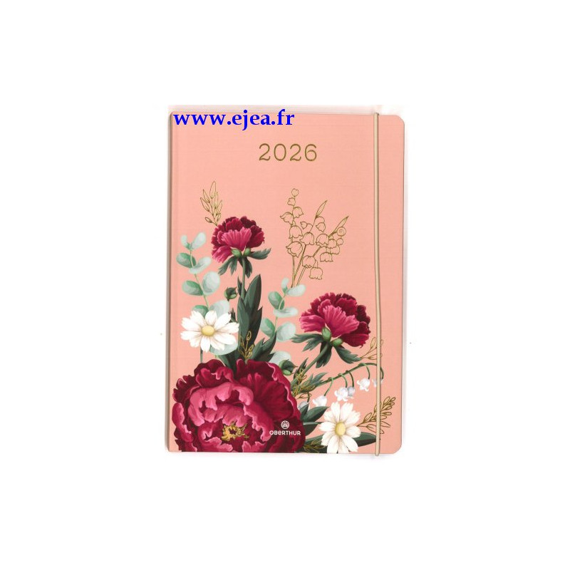 de Janvier à Décembre 2026 Calendriers, vacances scolaires, informations pratiques, atlas en couleurs. Planning vertical 1 semaine sur 2 pages avec cadres et espaces de notes, impressions une couleur par jour, pages blanches, coins perforés et signet marque-page, couverture cartonnée rigide avec détails et millésime dorés métallisés, fermée par un élastique, pochette en fin d'agenda.