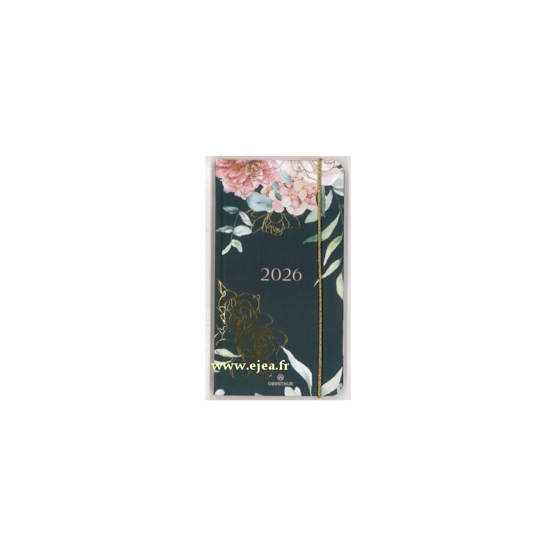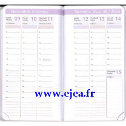 de Janvier à Décembre 2026 Calendriers, vacances scolaires, informations pratiques, atlas en couleurs. Planning vertical 1 semaine sur 2 pages avec cadres et espaces de notes, impressions une couleur par jour, pages blanches, coins perforés et signet marque-page, couverture cartonnée rigide avec détails et millésime dorés métallisés, fermée par un élastique, pochette en fin d'agenda. Format poche 9,5x17cm.