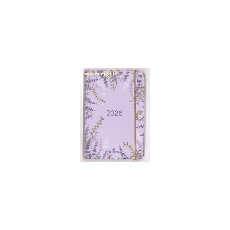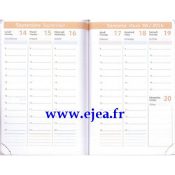 de Janvier à Décembre 2026 Calendriers, vacances scolaires, informations pratiques, atlas en couleurs. Planning vertical 1 semaine sur 2 pages avec cadres et espaces de notes, impressions une couleur par jour, pages blanches, coins perforés et signet marque-page, couverture cartonnée rigide avec détails et millésime dorés métallisés, fermée par un élastique, pochette en fin d'agenda. Format poche 10,5x15,5cm.