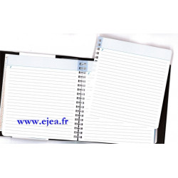 Reliure spirales permettant une ouverture facile. Pages blanches lisses pour une écriture fluide, papier issu de forêts gérées durablement, reliure spiralée, coins perforés, règle, couverture souple simili cuir fermée par un élastique, fabriqué en France.