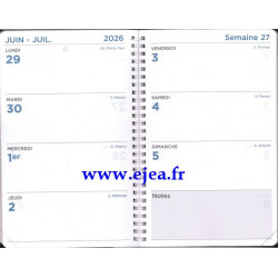 Semainier spiralé à gros caractères afin de faciliter la lisibilité au quotidien. Format : 16x24cm de Décembre 2025 à Décembre 2026. En gros caractères également : calendriers, vacances, informations pratiques, répertoire. Planning horizontal semaine sur 2 pages.
