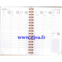 de Janvier à Décembre 2026 Calendriers, vacances scolaires, informations pratiques, atlas. Planning vertical 1 semaine sur 2 pages, pages blanches, coins perforés, couverture cartonnée rigide, reliure avec spirales. Format 10x15,5cm.