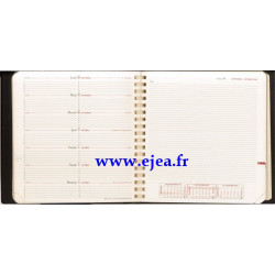 Calendriers, vacances scolaires, atlas couleur, répertoire amovible. Planning horizontal semaine sur page de gauche et page de notes à droite.
