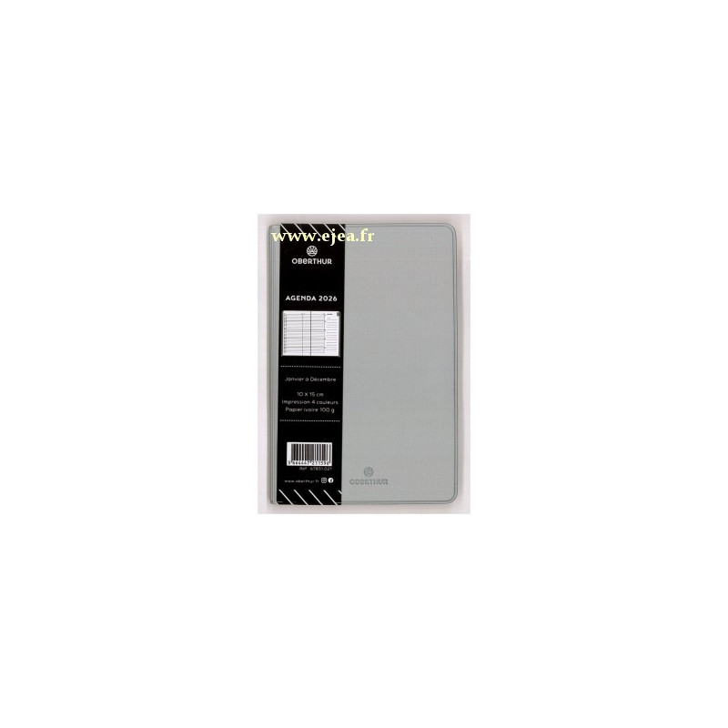 10,5x15,5cm de Janvier à Décembre 2026 Calendriers, vacances scolaires, informations pratiques, pages de notes, répertoire amovible. Planning horizontal couleur 1 mois sur 2 pages avec index pour chaque mois/page. Couverture amovible, aspect simili cuir métallisé. Pages couleur ivoire 100g haute qualité, fabriqué en France.