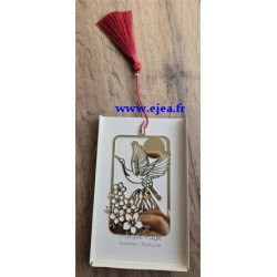 Marque-page plat en métal doré et motifs évidés avec une pampille en fils à laisser dépasser du livre.