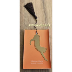 Marque-page plat en métal doré et motifs évidés avec une pampille en fils à laisser dépasser du livre.