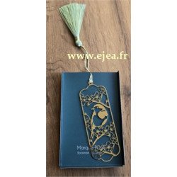 Marque-page plat en métal doré et motifs évidés avec une pampille en fils à laisser dépasser du livre.