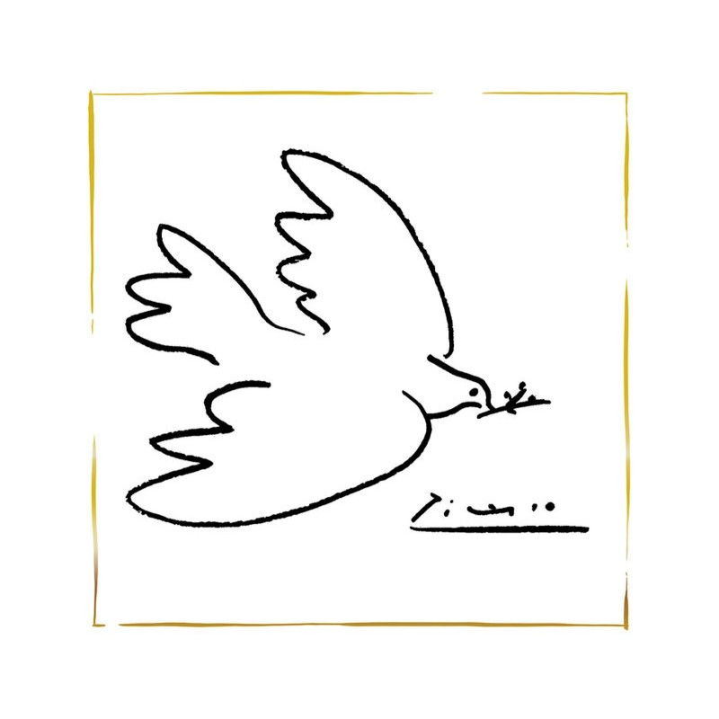 Reproduction de l'oeuvre de Pablo Picasso : La Colombe de la Paix. Format plié carré : 13x13cm, enveloppe couleur ivoire comprise. Contour métallisé or. Cette carte a été créée, imprimée et façonnée en France par les Editions du Désastre sur leurs presses de Mâcon en Bourgogne dans le respect des normes environnementales.