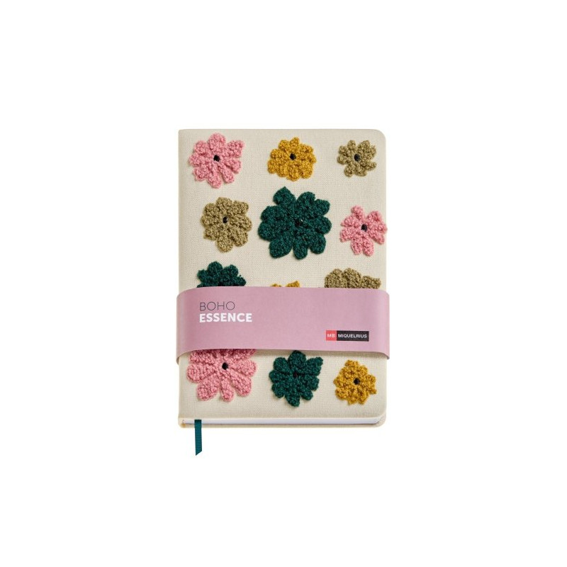 Couverture cartonnée rigide entoilée rembourrée avec fleurs en tissu bouclette. Marque-page/signet. 160 pages lignées, papier blanc 80g. Format A5 / 15x21cm.