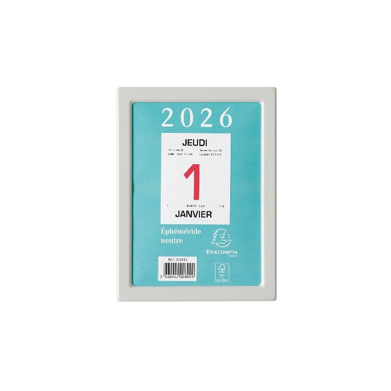 Calendrier Une page par jour du 1er janvier au 31 décembre avec de grands chiffres, à l'exception des week-ends : samedi et dimanche sont sur une page, avec le saint du jour, les horaires du soleil, les phases de lune, le numéro du jour croissant et descendant à coller ou poser sur un bureau 10,5x14x3,5cm Exacompta