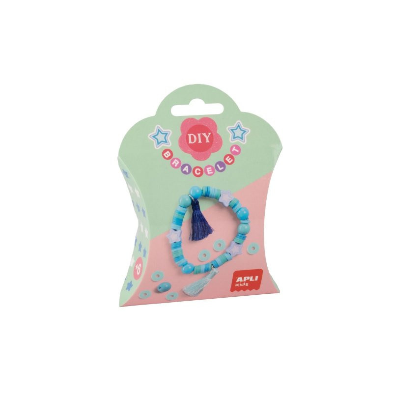Un petit kit tout simple contenant tout pour fabriquer un joli bracelet : des perles heishi (plates) des perles rondes, des perles en formes d'étoiles, du fil et des pampilles.