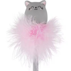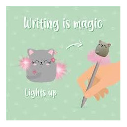 Figurine de chat avec plumes qui s'éclaire lorsqu'on la tapote. Stylo bille pointe moyenne, encre bleue. Longueur totale du stylo 19,5cm
