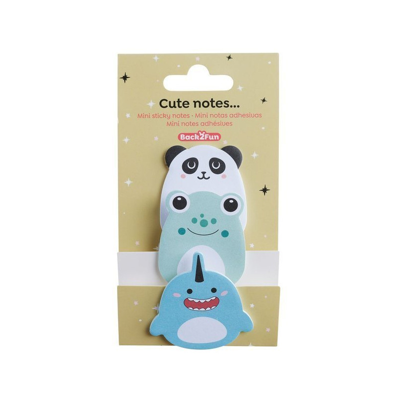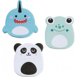 3 petit blocs de notes adhésives de 60 feuillets, papier 80g. 3 modèles : panda, grenouille, narval. Dimensions d'une note : 4x5cm environ.