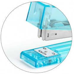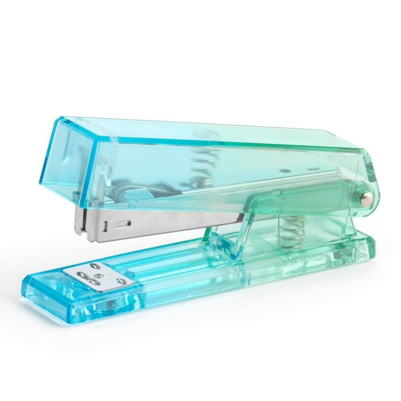 Agrafeuse de bureau, entièrement en métal, mécanisme en métal, extérieur en plastique résistant transparent avec un joli dégradé bleu-vert, fonctionne avec des agrafes n°24/6 pouvant attacher une vingtaine de feuilles ensemble. Dimensions de l'agrafeuse : 12,9xx6,4x3,4cm.