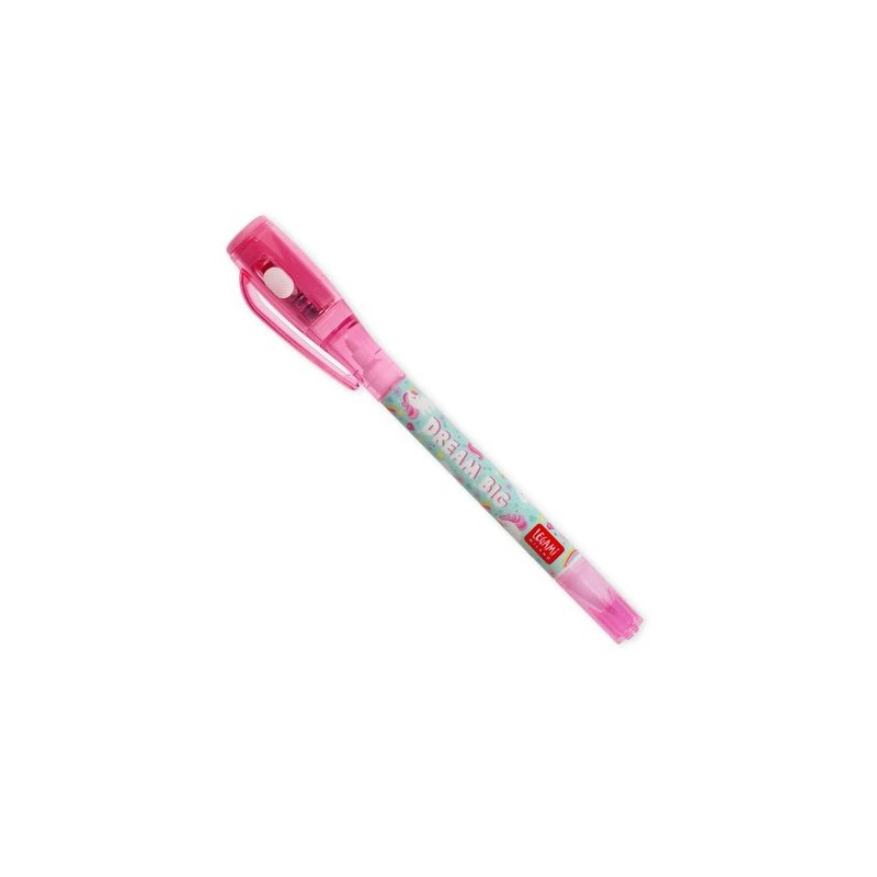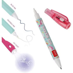 Tel une baguette magique ou tel le stylo préféré des espions, écris tes messages à l'encre invisible et fais les apparaitre grâce à la lumière au bout du capuchon ! Et de l'autre côté du stylo une 2ème pointe bille encre bleue classique. Longueur du stylo 15cm